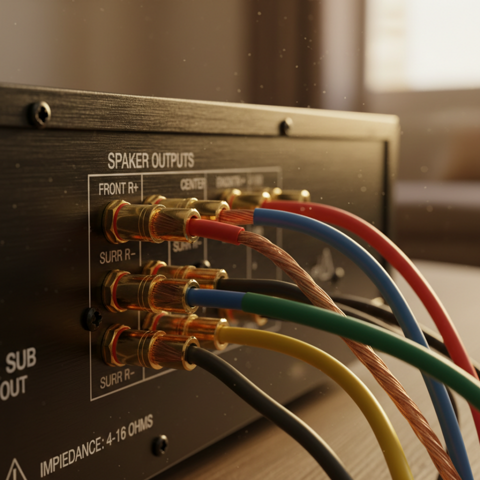 - **Repeat for All Speakers:** Follow the same process for every speaker in your system (Front Right, Center, Surround Left, Surround Right, etc.), always maintaining consistent polarity. Once all speakers are connected, give a gentle tug on each wire at both the speaker and receiver ends to ensure they are securely fastened and won’t easily pull out.